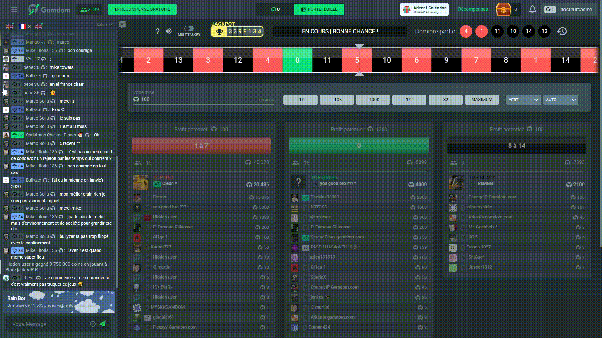 Vous retrouverez ces jeux nul par ailleurs, puisqu’ils ont été développés PAR et POUR Gamdom. Ils sont live, multijoueur et interactif.. Voici un exemple avec la roulette façon Gamdom :