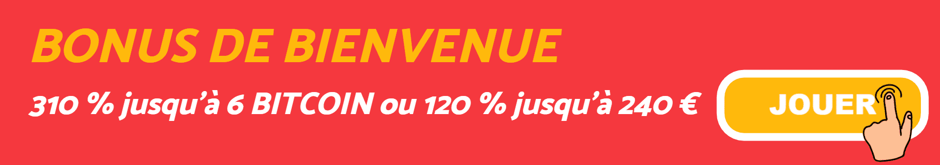 Le BONUS DE BIENVENUE est de 120 % jusqu’à 240 € avec 20 tours gratuits OU 310 % jusqu’à 6 BITCOIN.